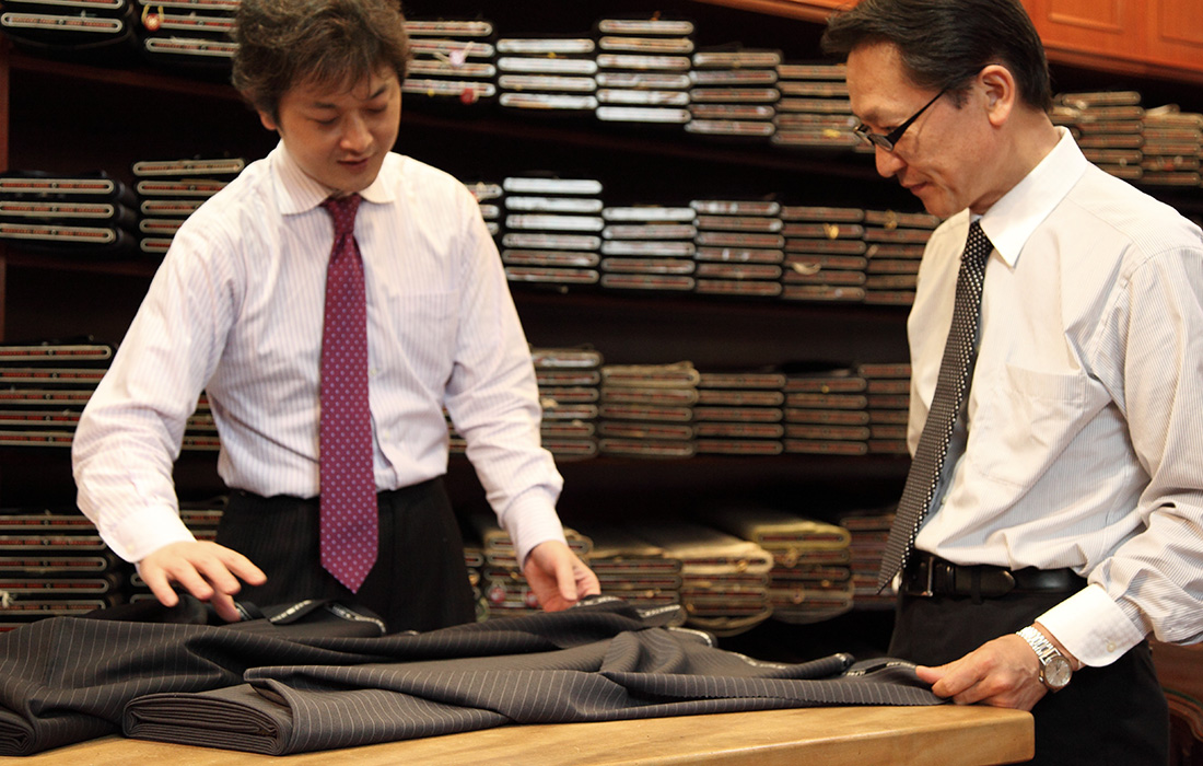 私共は背広を単なる消耗品とは考えておりません。技術者の目で選りすぐった服地の中からお好みの服地をお選びいただき、採寸〜型紙作り〜仮縫い〜ご試着〜補正〜本縫い〜検品、そして最後の納品に至るすべての過程において、背広に対する徹底的なこだわりを持つ技術者達による妥協を許さない作業を加え、既製服とはまったく違ったコンセプトを持つ耐久消費財を作り上げます。“背広に対するお客様の満足度を、常に最高のレベルで維持したい”これが私共の願いです。一着20〜30万円という価格は、そのような満足感を得ていただくための技術料であり、お客様にとっては安心料、満足料とお考えいただきたいのです。